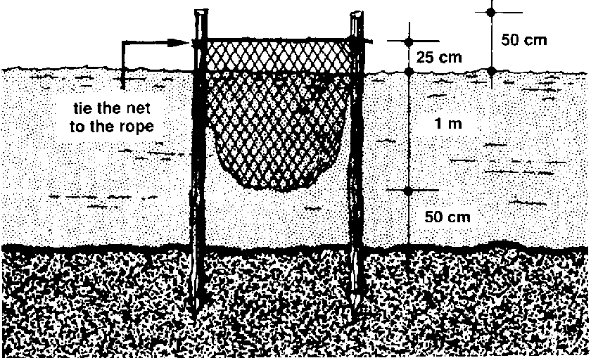 453 Hang a piece of fish net over the rope inside the posts and make sure that it is at least 1 metre under the water at the deepest part.