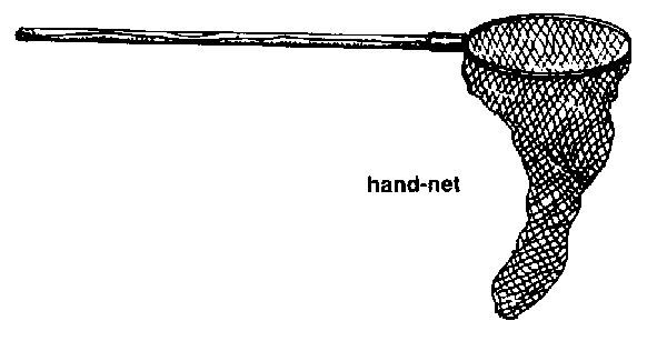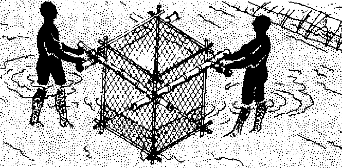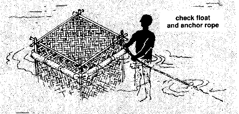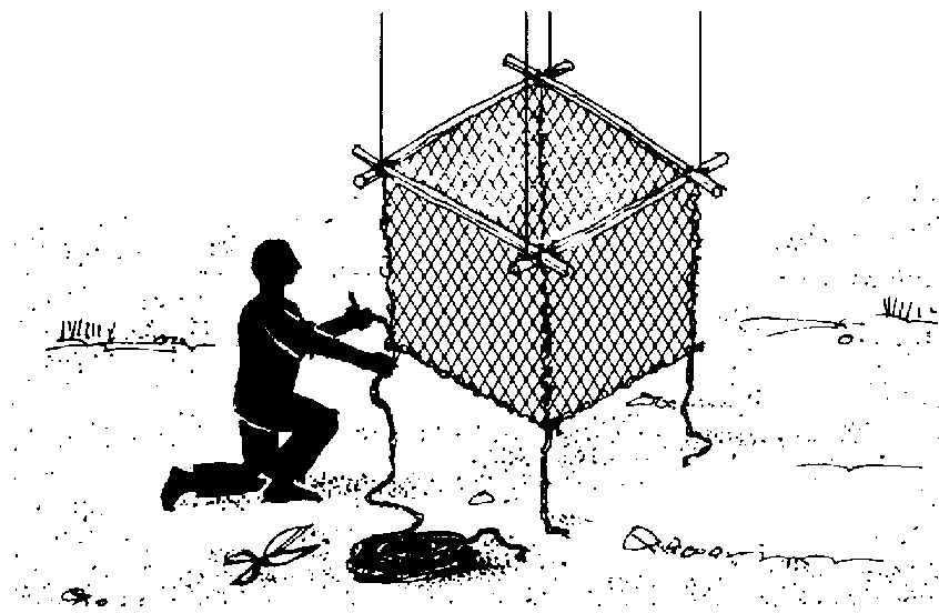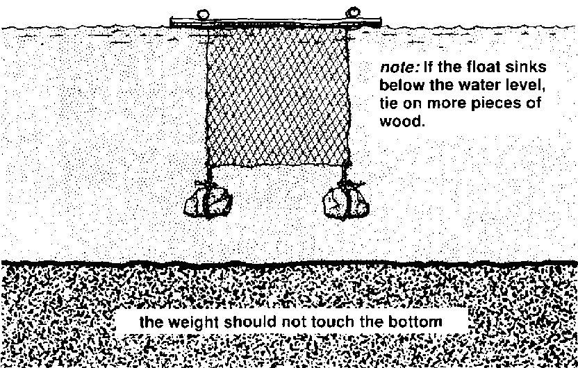 464 Now, if you have used fish net or woven material, tie a weight to the rope at each corner; the weight should not touch the bottom.