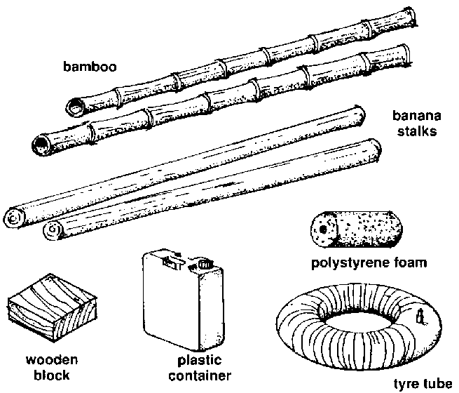 472 For floats you can use bamboo, banana stalks, wooden blocks or, if you can get them, plastic containers, pieces of polystyrene foam or used tyre inner tubes.