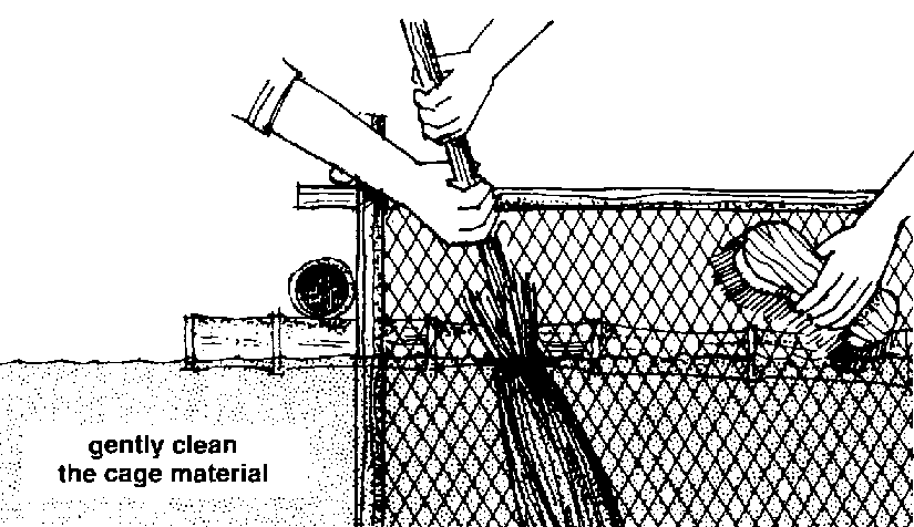 509 You can clean the material of a cage using a brush or a broom. However, do it very gently so that you do not damage the cage material.