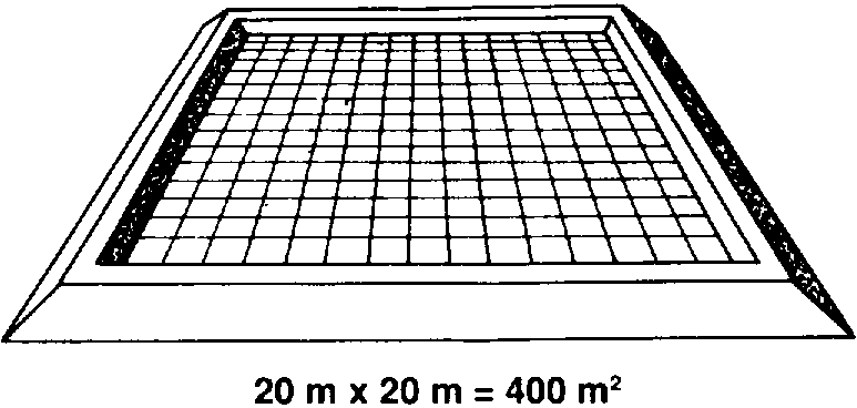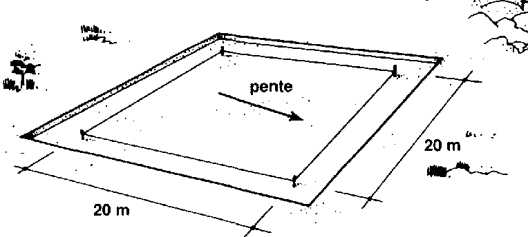 54 Délimitez ensuite un carré plus petit d'environ 20 m x 20 m à l'intérieur du grand carré. Marquez les coins avec des piquets et tendez un cordeau entre les piquets pour délimiter les talus intérieurs.