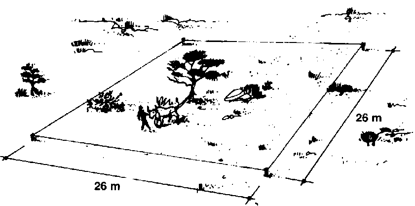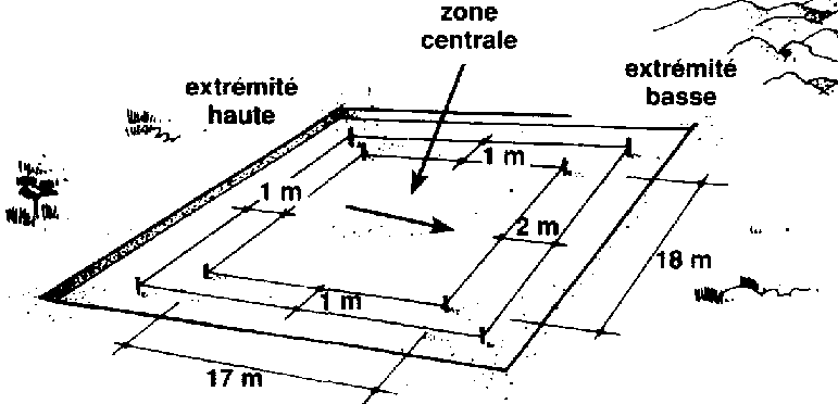 58 Assurez-vous que tous les piquets et tous les cordeaux délimitant le carré de 26 m x 26 m, le carré de 20 m x 20 m et la zone centrale sont bien placés comme indiqué sur les dessins.