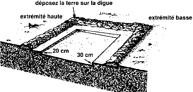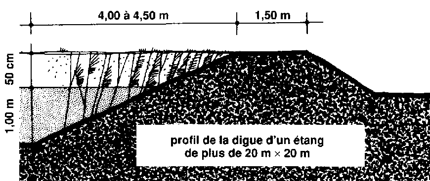 55 Dans la partie peu profonde de l'étang et le long des côtés, le dénivelé entre la base de la digue et l'extrémité haute et les côtés du petit carré devra être d'environ 1 m.