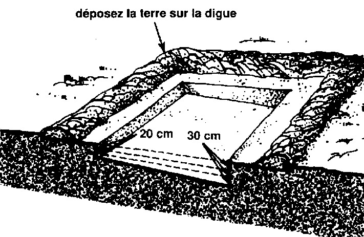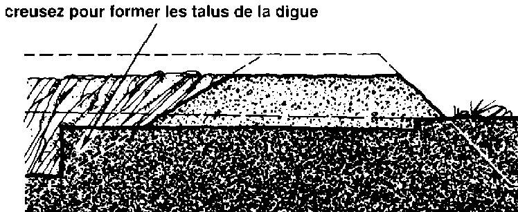 70 Retirez la terre des bords de la zone centrale pour former le talus de la digue. Placez cette terre sur la digue et tassez-la bien.
