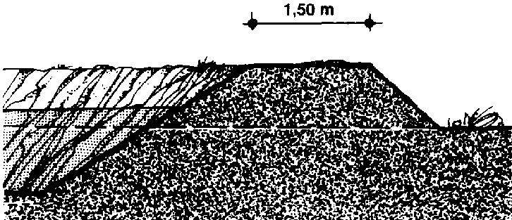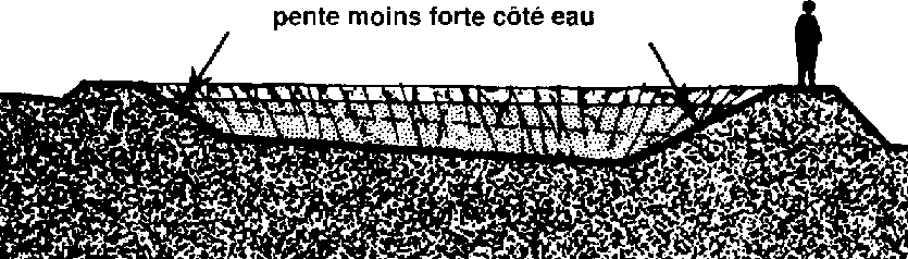 71 La face interne de la digue doit avoir une pente moins forte que la face externe. Le dessin fait apparaître le profil de la digue lorsqu'elle est terminée.