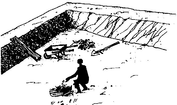 76 Maintenant, creusez au fond de l'étang une tranchée allant du centre vers l'extrémité basse. Cette tranchée doit avoir environ 50 cm de large et 20 cm de profondeur. Elle vous permettra de vidanger entièrement votre étang.