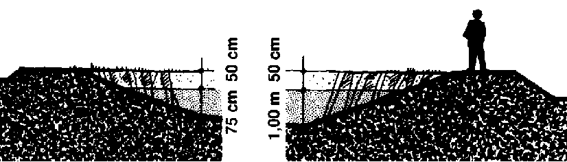 68 De nouveau, pour la troisième et dernière fois, creusez dans la zone centrale encore 20 cm à l'extrémité haute et 30 cm dans la partie la plus profonde. Déposez la terre sur la digue et tassez-la le plus possible.