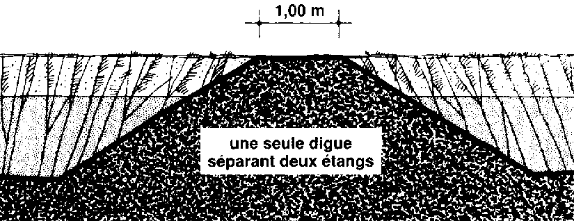 Remarque: Lorsque les étangs sont construits l'un à côté de l'autre, il ne vous faudra qu'une seule digue entre deux étangs. Si vous construisez en même temps deux étangs côte à côte, vous pouvez ne prévoir que 1 m de large au lieu de 1,50 m pour la digue.