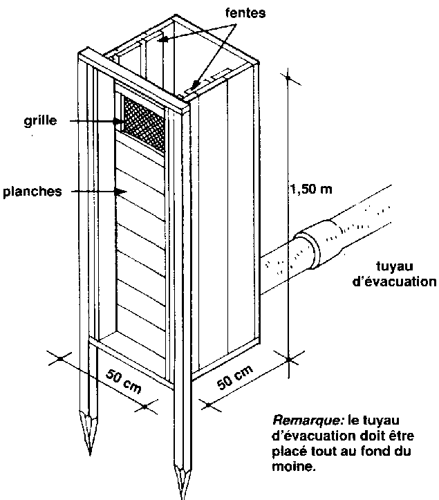 98 Le tuyau d'évacuation peut être fait d'une grosse tige de bambou ou d'un tuyau de plastique ou de métal. Il devra avoir environ 10 cm de diamètre. La digue étant beaucoup plus large en bas qu'en haut, le tuyau d'évacuation devra être plus long que le tuyau d'arrivée