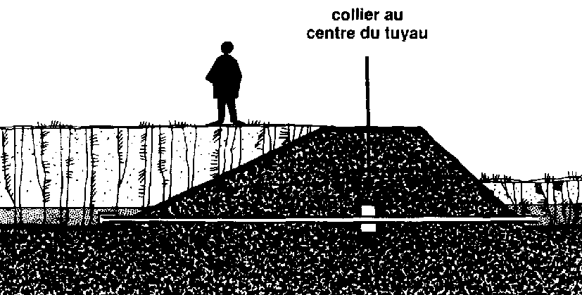 100 Si vous ne pouvez pas vous procurer un tuyau assez long pour traverser la digue, vous pouvez mettre bout à bout des sections de tuyau plus courtes à l'aide de raccords comme le montre le dessin