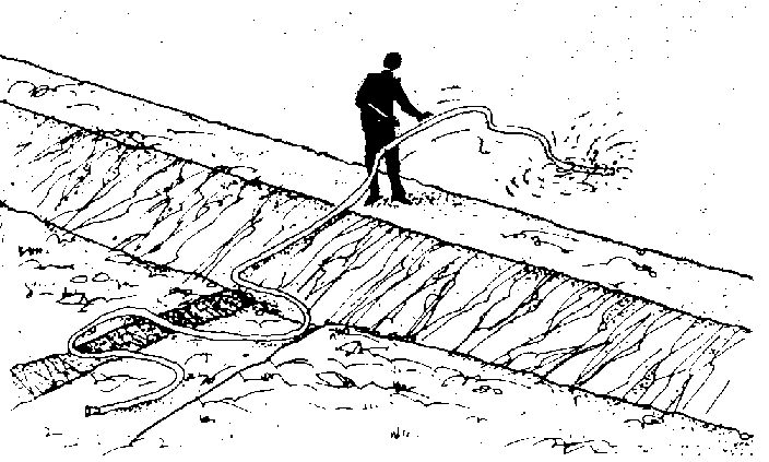104 Placez le tuyau d'évacuation dans la trouée pratiquée dans la digue et reformez la digue par-dessus.