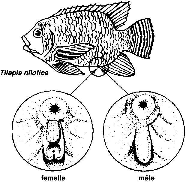 239 Mettez bien le nombre voulu de mâles et de femelles dans l'alevinier. Le dessin vous montre la différence entre le mâle et la femelle de tilapia.