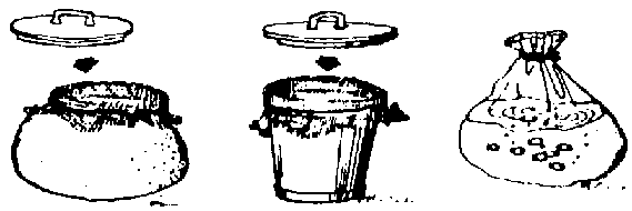 Un pot en terre avec un couvercle, un seau avec un couvercle, un sac en plastique.