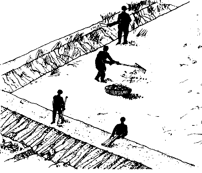 355 Si vous trouvez des fuites dans la digue, ou au niveau de l'arrivée, de l'écoulement ou du trop-plein, bouchez-les avec de la bonne terre argileuse.