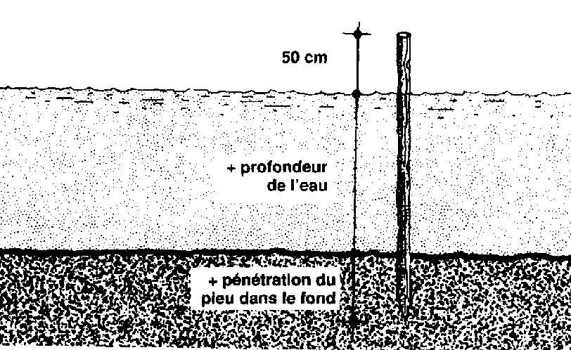 385 Tous les pieux doivent dépasser d'au moins 50 cm le niveau le plus élevé de l'eau. Calculez la longueur d'un pieu: 50 cm au-dessus de la surface de l'eau, plus la profondeur de l'eau, plus la profondeur à laquelle il doit être enfoncé dans le fond.