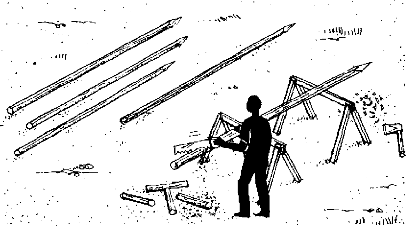 378 Un enclos est fermé par une clôture. Commencez par enfoncer une série de pieux. Les pieux peuvent être en bois ou en bambou.