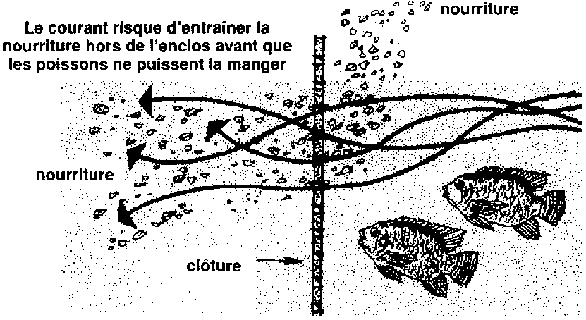 405 En revanche, lorsqu'il s'agit d'un enclos aménagé dans un cours d'eau, un lac ou une retenue d'eau, les aliments naturels peuvent manquer et le courant risque d'entraîner la nourriture que vous donnez aux poissons en dehors de l'enclos, là où ils ne peuvent pas l'attraper.