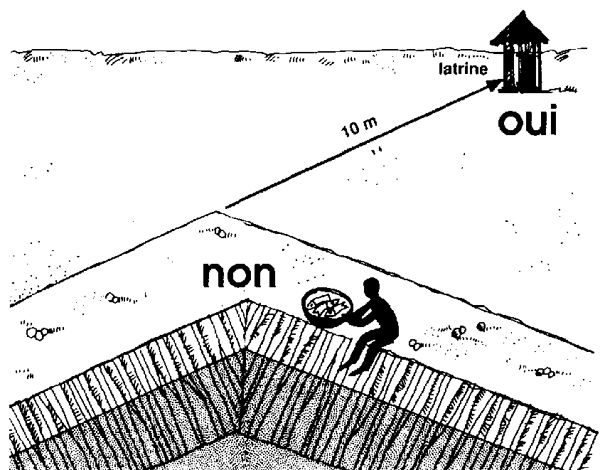 538 Si vous avez une latrine, utilisez-la. Sinon, construisez-en une à 10 m au moins du bord de l'un quelconque de vos étangs ou enclos et de votre source d'alimentation en eau.