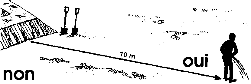 539 Si vous êtes pris d'un besoin pressant pendant que vous travaillez près de vos étangs ou de vos enclos, du cours d'eau qui les alimente, de la tranchée d'alimentation ou des rigoles d'arrivée, éloignez-vous d'au moins 10 m pour satisfaire ce besoin.