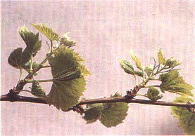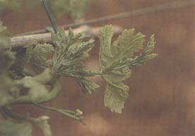 Field symptoms include delayed bud breaking, slow bushy growth of the shoots in the initial stages of vegetation and presence of laminar or cup-shaped outgrowths (enations) on the underside of the eight to ten leaves at the base of the shoot (Figures 110 and 111). Leaves with enations are misshapen and deeply laciniated, and shoots are variously deformed and sometimes cracked in the basal internodes. Symptoms are erratic and do not recur every year on the same vines.