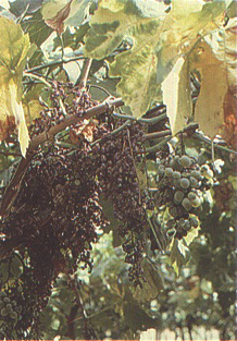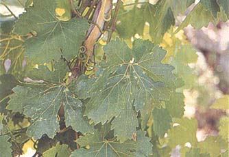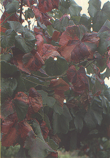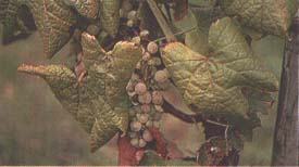 FIGURE 121 Close-up of Baco 22A leaves with symptoms of flavescence dorée. Note shelling and shrivelling of the cluster