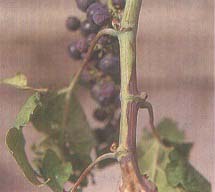 Symptoms usually appear in late spring. Growth can be reduced and the internodes are shortened. The leaves have downward rolled margins, and the shoots may exhibit a drooping condition because of irregular maturation of the wood (Figure 119) and lack of phloem fibres. As the season progresses, the severity of symptoms increases: rolling of the leaves becomes more intense and the blades are discoloured, turning yellow in white-berried cultivars (Figures 120 and 121) or red in red-berried cultivars (Figures 122 and 123). Necrosis along the main veins may develop in autumn. The internodes may show black pustules (Figure 124) and sometimes longitudinal splitting of the bark. The crop is much reduced. Inflorescences may dessicate when symptoms first appear. If bunches are formed, the berries wither and dry up or drop at the slightest shaking of the vine. Some affected vines die, usually in the year following infection. The survivors recover naturally and do not show symptoms unless they are infected anew. Wild American Vitis species are infected without showing symptoms.
