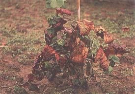 Grafting is done to Vitis rupestris x Vitis berlandieri 110 R. Symptoms consist of necrosis of the veinlets on the underside of the leaf blade (Figure 113). The necrotic reactions develop first in the leaves at the base of the shoots and then, as the shoots grow, on the younger leaves. With time, necrotic spots also appear on the upper side of the leaf blade. Severe strains may induce necrosis of tendrils and dieback of green shoots. An almost complete cessation of growth ensues, and the indicator may die. In the field or greenhouse, symptoms appear six to eight weeks after inoculation, but mild strains may induce positive reactions the year after grafting. The symptoms are clearly shown, persist throughout the vegetative season and are readily recorded. Reading of symptoms should be made eight to ten weeks after inoculation.
