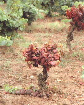 FIGURE 123 Reduced vigour, stunting and leaf reddening of cv. Aramon caused by flavescence dorée