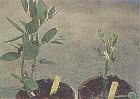 FIGURE 127 Broad bean plant artificially infected with the agent of flavescence dorée (right) next to a healthy plant (left)