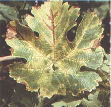 FIGURE 129 Severe yellowing of the leaf blade and necrosis of the main vein induced by bois noir infection in a white-berried cultivar (Photo: G Granata