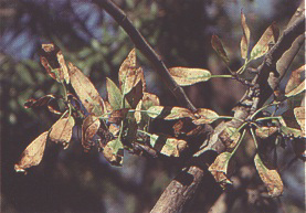Other Vitis species are hosts of X. fastidiosa; native Vitis species are believed to serve as reservoirs of infection in much of the southeastern United States (Hopkins, 1988). In addition, the pathogen has a wide natural host range that includes both annual and perennial plants of many genera (Raju, Goheen and Frazier, 1983). Many plant hosts show either no symptoms or mild symptoms. Xylella fastidiosa causes several diseases, including almond leaf scorch (Figure 132), alfalfa dwarf and a disease of macadamia in Costa Rica. Other Xilella species are known to cause phony peach disease and a scorching disease of numerous tree species. The taxonomic relationship of X. fastidiosa to the strains that cause these diseases is as yet undetermined (Hopkins, 1988).