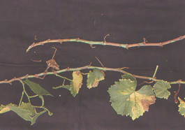 Early season foliage may show interveinal chlorosis (Figure 133) and develops more slowly than foliage on surrounding healthy vines. In midsummer, as water stress from vascular plugging begins to affect the plant, asymmetrical yellowing of the leaf margins is seen. These discoloured regions become progressively more necrotic until autumn (Figures 134 to 136). Yields are reduced, and clusters are often shrivelled (Figure 137). Leaves fall prematurely, leaving the petiole intact on the vine (Figure 138). This symptom is considered diagnostic for PD. Canes mature unevenly in the autumns leaving patches of immature green wood (Figures 139 and 140).
