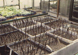 Canes of indicator vines are withdrawn from cold storage just before use and are cut into cuttings of two to three nodes. The cuttings are planted with the basal part about 6 cm deep in moist sand, directly on a bench heated at 25 to 27°C or in trays placed on the heated bench (Figure 211). When rooted (Figure 212), the cuttings are potted in clay or plastic containers and kept in a greenhouse at 22 to 24°C for a couple of weeks before grafting. During this period rooted cuttings do not require special care if the environment is clean and the potting mixture was properly sterilized before use.