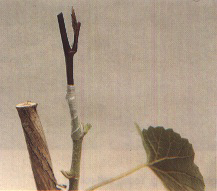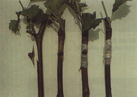 Wood of candidate vines to be indexed is removed from storage the day before its use and held at room temperature (20 to 22°C). For grafting, a bud (or a chip of wood from the internode) is removed from the cane of the donor vine by making a cut above the bud, then a cut at an angle just below the bud, letting the knife travel smoothly upward through the wood until it reaches the first cut. A notch of a size compatible with that of the chip taken from the candidate vine is made on the indicator just below the top shoot. The chip is placed in the notch, tied with budding rubber and wrapped with plastic tape or plastic film (Figure 213).