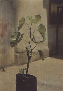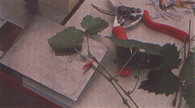 For small-scale indexing the stocks, which can be either indicators or candidate vines, are forced to grow vigorously to allow development of one robust shoot (Figure 231). This shoot is cut at the level of the third or fourth internode (Figure 232). Green scion material the same size as that of the stock is collected (Figure 233) and grafted by making a slanting cut that fits into a comparable slant on the stock or by inserting a wedge-cut shoot tip into a cleft made in the shoot of the stock (Figure 234). The graft is tied with plastic grafting tape or plastic film (Figure 235) and protected from dehydration with a polythene bag (Figure 236). The bag is removed after a couple of weeks and the graft is left on the greenhouse bench for appearance of symptoms. For large-scale indexing, a mechanized green grafting technique has recently been developed in France by INRA (Institut national de la recherche agronomique, Colmar) and GCEV (Groupement champenois d'exploitation viticole, Mumm Recherche, Epernay) (Walter et al., 1990).