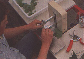 Wedge-shaped, one-bud cuttings are inserted into a V-shaped cleft made at the top of the cuttings of the indicator by means of an appropriate grafting machine (Figure 238) (Martin et cl/., 1987). Scions and stocks are held together by small plastic clothes-pegs (Figure 239). Each grafted green cutting is then inserted with the basal extremity into a rockwool cube (Figure 240) and maintained in a plastic forcing chamber under saturated humidity at 25°C for at least 18 days. The cubes are watered twice a week with the above nutrient solution. The grafts are moved from the forcing chamber to greenhouse boxes at temperatures most appropriate for the expression of symptoms of the various diseases (e.g. 22°C for leafroll and fleck, 26°C for vein necrosis). Symptoms of fanleaf, leafroll (Figure 241), fleck, corky bark (Figure 242), stem pitting (Figure 243), vein mosaic (Figure 244), vein necrosis (Figure 245) and graft incompatibility appear much more quickly (20 to 60 days, except for stem pitting, which requires three to five months) than with conventional indexing techniques.