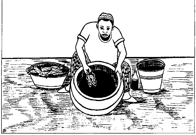 (i) Dressing: It was observed in Ghana and Senegal that fish may be held under the foot on the ground during dressing. This practice can cause microbial contamination of the fish and injury to the processor either from the spines of the fish or by the knife.