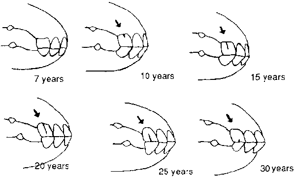 This is another way to tell the age of the horse from 10 to 30 years. It appears at 10 years of age as a little canal on the top of the corner front teeth. By 15 years of age it has reached the middle of the tooth and at 20 years it has reached the bottom. It then starts to fill up and by 30 years of age the groove has disappeared.