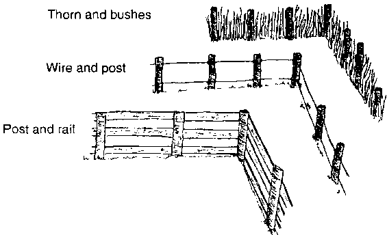 Fields for equines should be well fenced. Fencing needs to be strong and can be post and rail or wire. If a wire fence is used the bottom wire needs to be at least 30 cm off the ground to prevent animals getting their feet caught in it. A good strong hedge which the animals cannot push through not only acts as a barrier but will provide shelter against wind. Hedges should be made of thorn or other strong bushes planted in two parallel rows.