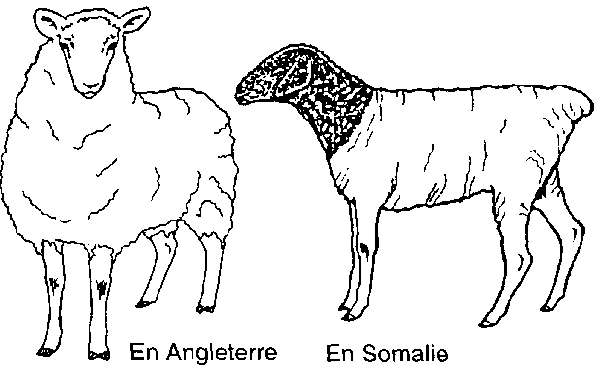 · En Angleterre, les moutons ont une toison épaisse qui les protège du froid l'hiver. En Somalie, où le climat est très chaud, les ovins ont un pelage léger composé de poils.