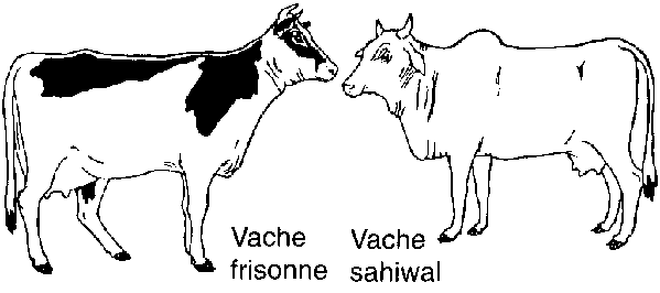 · Les vaches frisonnes produisent beaucoup de lait sur les riches herbages des pays à climat frais. En Inde, les bovins de la race Sahiwal sont de bons producteurs de lait dans un climat tropical chaud.