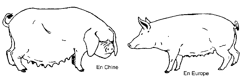 · En Chine, les porcs sont nourris principalement d'aliments de lest et ont donc acquis un gros ventre pour assimiler ce type de nourriture. En Europe, les porcs mangent beaucoup de céréales et leur corps est moins gras.