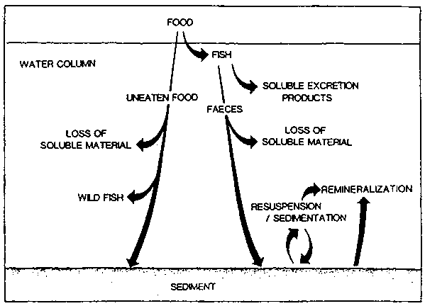 117. So far, most estimates of waste production have been published for temperate carnivorous fish species, in particular salmonids. A graphic illustration of the fate of waste material released from intensive fish farming is given in Figure 9. It is possible to estimate the amounts of uneaten food, faeces and excreta produced from data on feed qualities and quantities, food conversion ratio (FCR) values, digestibilities and faecal composition, and to produce mass balance equations for various waste parameters, such as nitrogen, phosphorus or carbon, solids or biological oxygen demand (Beveridge et al., 1991).