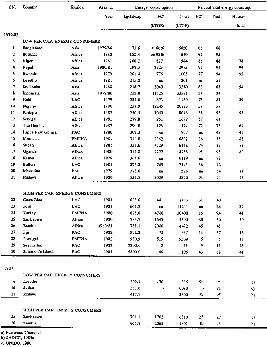 There is diversity in the energy consumption patterns of the countries. Therefore, for a meaningful analysis, it is useful to classify the countries on the basis of relevant energy and energy mix indicators. The indicators selected are the per capita energy consumption, and the percentage of biomass consumption in the energy mix. In Table 1 the countries have been arranged according to increasing per capita total energy consumption and four main categories may be discerned. These are the low and high energy consumers which consume less and more than 600 kgoe per capita respectively, and under these categories are the high and low biomass consumers which consume more and less than 50% biomass respectively. The countries in the various categories are listed in Table 2 according to region and for 1979-1982 and 1987.