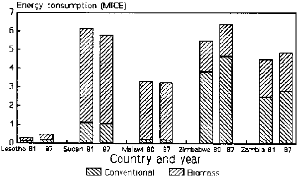 The changes that have occurred in the energy situation, including the fuelwood and charcoal contribution, are difficult to assess because of lack of data on consumption. The energy indicators for 1987 of some selected countries (Lesotho, Sudan, Malawi, Zimbabwe and Zambia), for which data were available, are given in Table 1. The energy mix of traditional and conventional fuels of countries for around 1980 and 1987 are given in Figure 4 for comparison. In general, there was no major change in the energy consumption patterns of the countries. The marginal energy consumption growth caused no changes in the consumption category classification (Table 1). The changes in the proportion of traditional biomass and commercial energy were also only minor, except for Lesotho (Table 4).