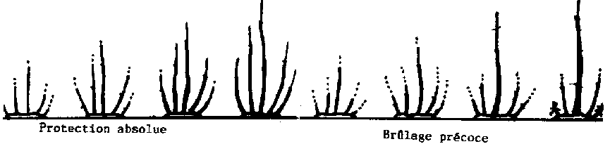 Dans le cas d'anciennes exploitations forestières dont le peuplement se reconstitue par rejet des souches et par semis formant des groupes denses de plantules, on peut affirmer que le brûlage hâtif est nettement préférable à la protection absolue même si cette dernière est réalisable sans risque d'accident. Le schéma suivant l'illustre.
