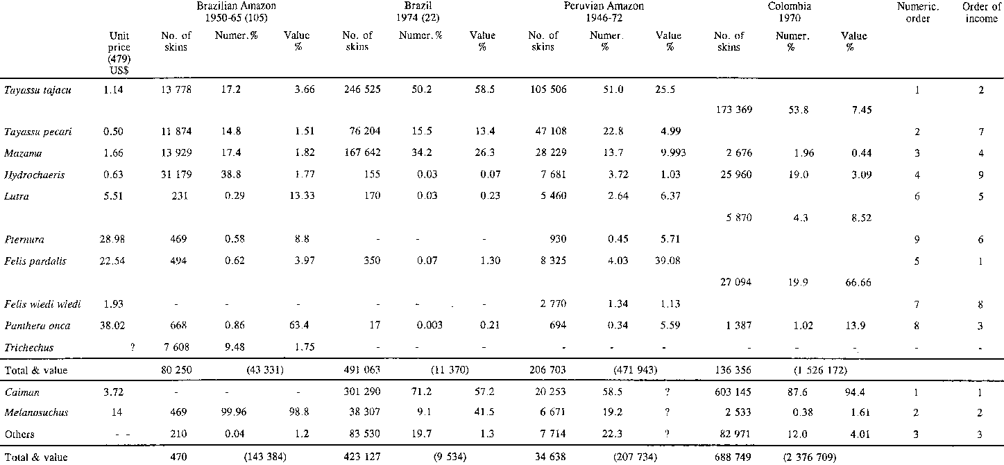 The boom in exports from 1946 to 1970 was undoubtedly the outcome of a soaring hunting effort plus new hunting grounds combined with the emergence of an army of specialized hunters in response to high demand and high prices. As a resource becomes scarce, prices spiral and increasing the effort becomes more cost-effective. To give one example, the price of one jaguar skin brings in about as much as one Brazilian campesino earns in six months (544). The hounding of fur-bearing carnivores during the sixties is thought to have made very heavy inroads into carnivore populations, but protectionist measures adopted by various countries in the area (Venezuela in 1963, Brazil in 1967, Ecuador in 1970, Peru in 1972 and Colombia in 1973) as well as the international measures (CITES, 1973), have considerably curtailed commercial hunting for skins. It is also quite likely that a number of money-making activities linked to the drug traffic (growing and selling coca and marijuana) are helping to draw the pressure off hunting (Hernández Camacho, pers. com.). Commercial hunting for bushmeat continues to affect vast tracts of tropical America. Population estimates in Amazon forests (180, 307, 573) show an alarming drop in the numbers of large mammals in areas of intensive hunting, and this is corroborated by qualitative evidence of the destructive impact of unregulated commercial hunting.