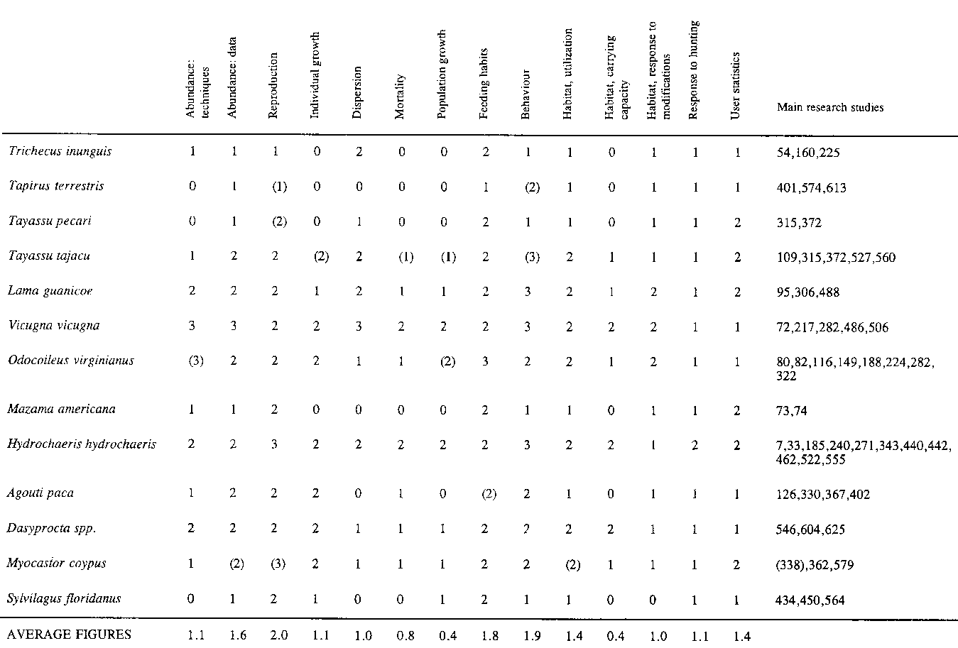 Generally speaking and in conclusion, while more and more biological data is available on the main game animals of Latin America, the data on species and geographical areas and the biological specifics are still very patchy. The predominant focus continues to be natural history, with population dynamics and relations with the habitat remaining in the background. Most of the fundamental contributions on the subject concern individual academic initiatives, i.e. university theses. It is often difficult for wildlife administrators to gain access to this information, particularly to papers done by foreign researchers. Another thing is that research usually concentrates on protected areas where wildlife population densities and overall ecology may well be quite unrepresentative of the region as a whole. With few exceptions, the government agencies responsible for wildlife affairs lack a coherent research policy focusing on the priority biological considerations from the management standpoint. The scarcity of biological data is therefore a serious constraint to the development of management plans. This is particularly true for Geochelone, Dasypus, Tapirus, Tayassu pecari, Mazama and Agouti for which very little is known in population terms, despite their significant contribution to the human diet in forest areas.