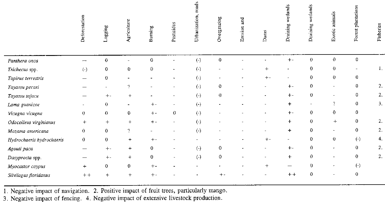Deforestation emerges overwhelmingly as the crucial environmental modifier for wildlife in Latin America, as is true most everywhere. Agriculture-related activities in the broad sense come second, with burning and pesticide contamination in third and fourth place. The fifth environmental modifier is roads, human settlement and urbanization, but here the differences between countries are considerable. Overgrazing and erosion are sixth and seventh in importance (relatively more so in the Andean countries). Hydraulic structures including dams, irrigation systems and the draining of wetlands are eighth. The final factor is introduced plant or animal exotics, which are fairly important in the Southern Cone countries. Under the heading "others" come oil and mining activities, fisheries and the scarcity of wild foods.