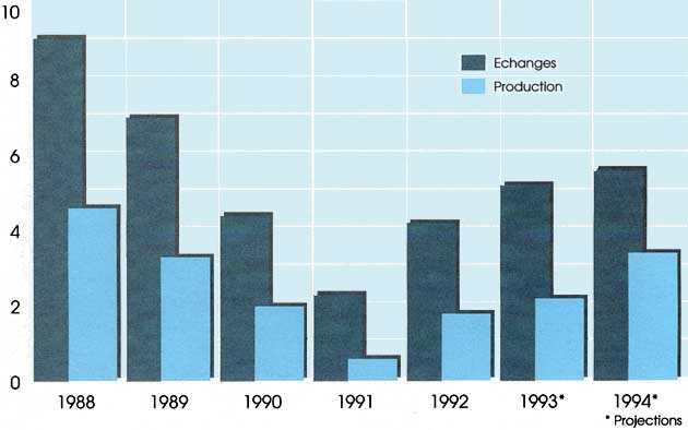 Les échanges de produits forestiers entre ces pays ont également subi le contrecoup de l'abandon des accords commerciaux conclus dans le cadre du Conseil d'assistance économique mutuelle (CAEM) et de la fixation des prix en monnaies convertibles. Les exportations vers d'autres régions ont aussi été touchées, en raison des problèmes de qualité et de compétitivité rencontrés sur les marchés occidentaux ainsi que des incertitudes provoquées par les changements des mécanismes commerciaux établis de longue date. Ainsi, les exportations totales de bois de sciage des pays d'Europe de l'Est et de l'ex-URSS sont tombées de 10,5 millions de m3 en 1987 à 6,4 millions de m3 en 1991.